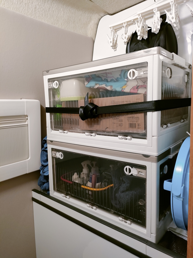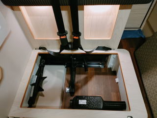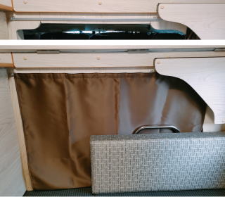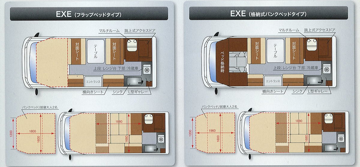 マンボウANVファイナルエディション2020は格納式バンクベッドなのですが、EXEはフラップベッドを選ぶこともできます。ダイネットをベッド展開して就寝することが多いと思うのでバンクベッドを押入れのような使い方にしたいと思い、フラップベッドタイプにしてもらいました。